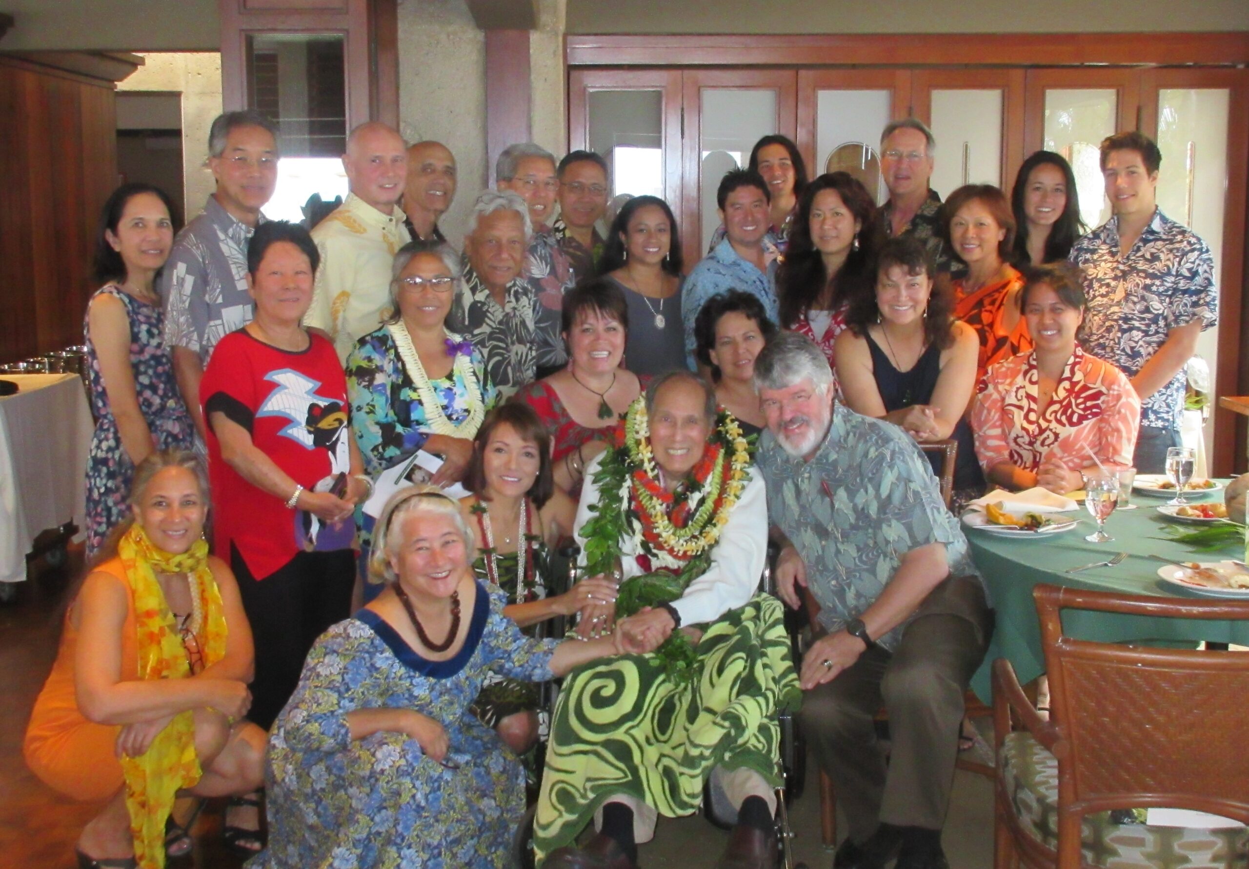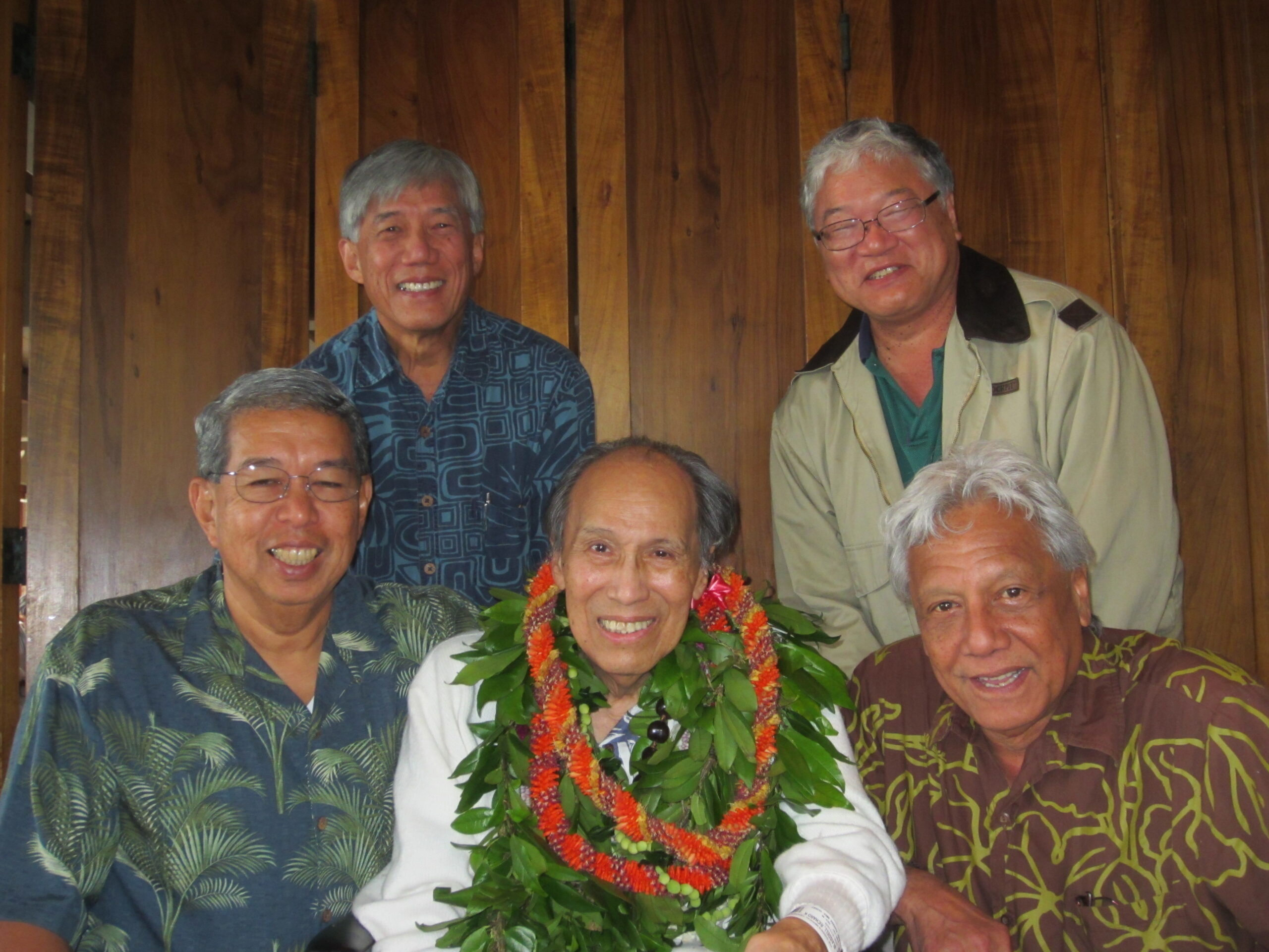 Kekuni is surrounded by 4 kanaka graduates of the first class of 1975 on his 89th birthday: Drs. Bill Ahuna, Nathan Wong, Richard Lee-Ching and Noa Emmett Aluli. 2014.